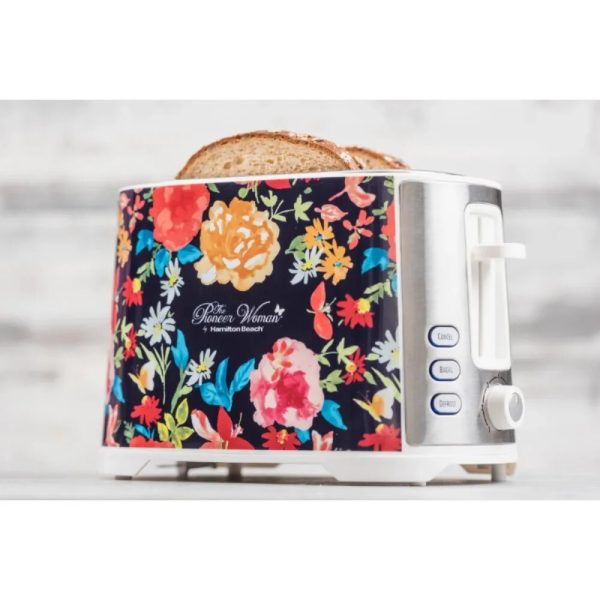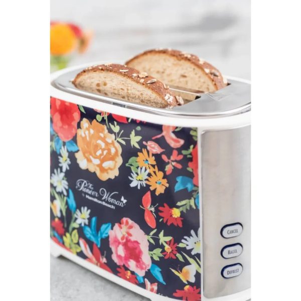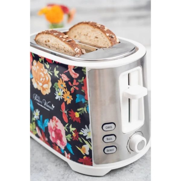 Fiona Floral Extra-Wide Slot 2 Slice Toaster toasts so much more than just your average sliced bread. Featuring the beautiful Fiona Floral pattern, this toaster boasts two extra-wide slots to fit a variety of different breads. Its advanced features make it perfect for toasting bagels, waffles, English muffins, and more. The defrost option conveniently handles some of your favorite breads such as toaster desserts and waffles, while the bagel option provides you with the perfect toasted bagel level for you to enjoy that crispy, yet still chewy, texture. When your breads are done, this gorgeous toaster’s high-lift boost feature makes it easier to retrieve the bread while keeping your hands safe from the heat. Making toasted sandwiches, croutons, breadcrumbs, and snack becomes an easy task when you bring home a Pioneer Woman Fiona Floral Extra-Wide Slot 2 Slice Toaster.
