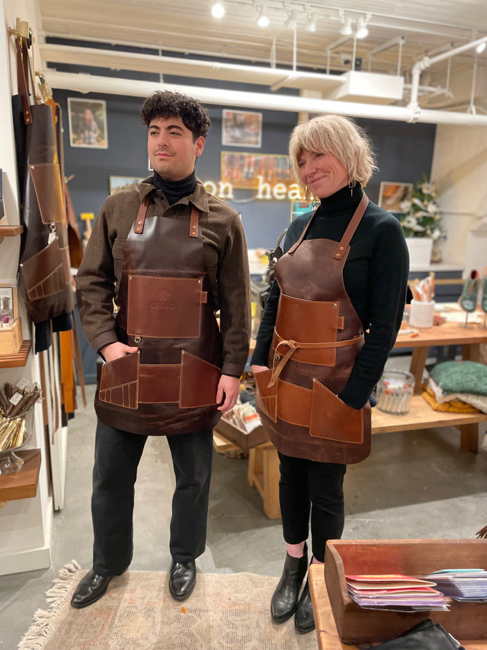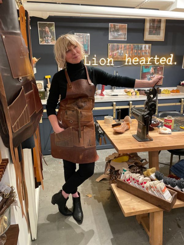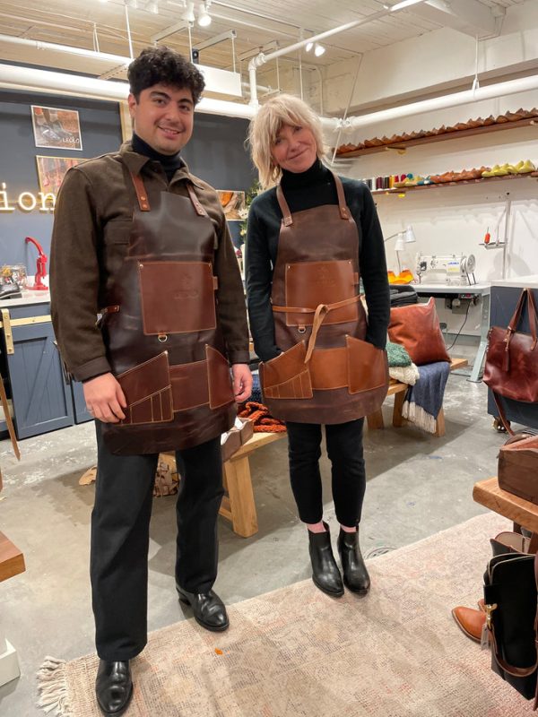 Our Leolo leather apron is one-of-a-kind. This is Leanne’s beloved Leolo apron, a steadfast tool that never disappoints. This apron has been Leanne’s trusted ally in creating each pair of Leolo Handmade Shoes and Boots. It wears beautifully and is remarkably resilient. It’s hand-sewn/stitched and made with the finest American leather. The second image is of Leanne’s well worn apron.
