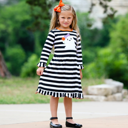Black and White Striped Halloween Dress with Friendly Ghost Appliqué. Long Sleeve, Swing Dress with ruffled sleeves. Knee Length (depending on the height of child). Finished with ruffle trim.
